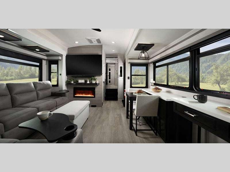 Sleeps 4 Slides 3 Length 40 ft 10 in Ext Width 8 ft 6 in Ext Height 13 ft 3 in Int Height 8 ft 4 in Exterior Color Midnight Charcoal, Midnight Gold, Silver Metallic Hitch Weight 2535 lbs GVWR 17500 lbs Dry Weight 14255 lbs Cargo Capacity 3245 lbs Fresh Water Capacity 75 gals Grey Water Capacity 87 gals Black Water Capacity 87 gals Tire Size 215/75R17.5'H Furnace BTU 40000 btu Available Beds King Refrigerator Type Residential Refrigerator Size 21 cu ft Convection Cooking Yes Cooktop Burners 4 Number of Awnings 2 LP Tank Capacity 40 lbs. Water Heater Type On Demand Tankless AC BTU 30000 btu TV Info LR Smart LED HDTV, BR 32" 4K Smart LED TV, EXT 40" 4K Smart LED TV Awning Info 11' and 19' Electric with multi-color LED Lights Axle Count 2 Washer/Dryer Available Yes Number of LP Tanks 3 Shower Type Walk-In Shower Electrical Service 50 amp Solar Wattage 400 watts Similar Floorplans